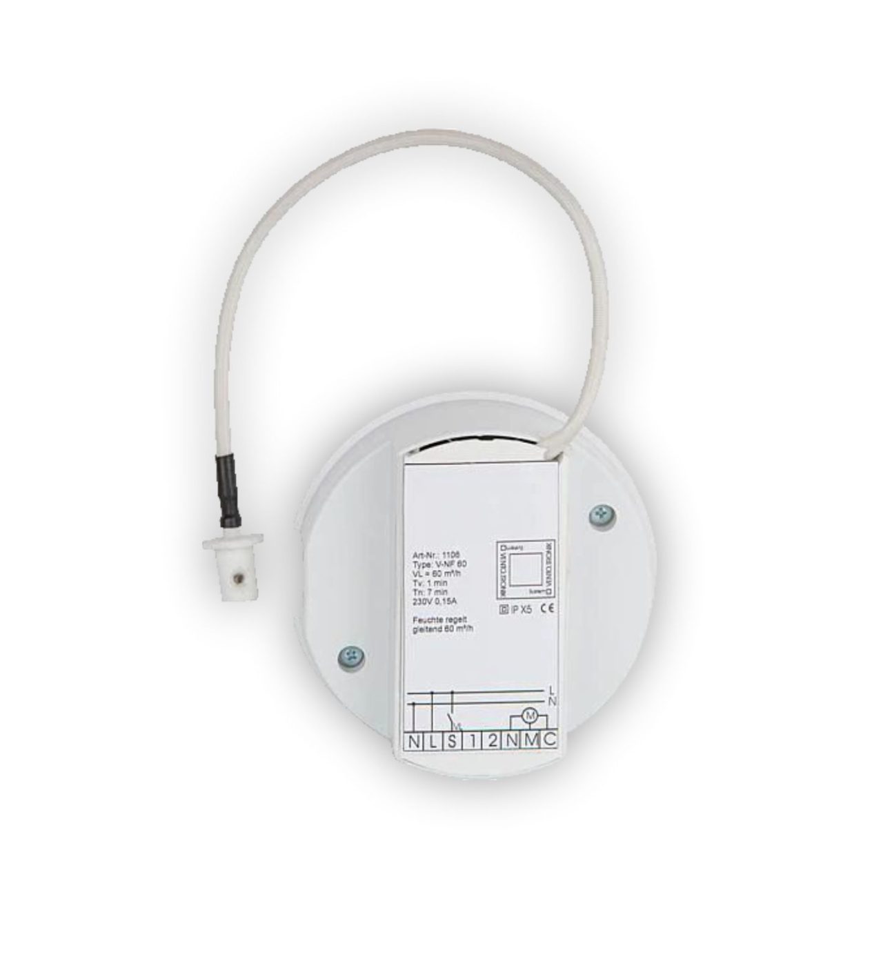 Riadiaci modul pre zaťaženie do 60 m³/h s reguláciou vlhkosti a oneskorením zapnutia o 60 sekúnd a dobou dobehu 7 minút.