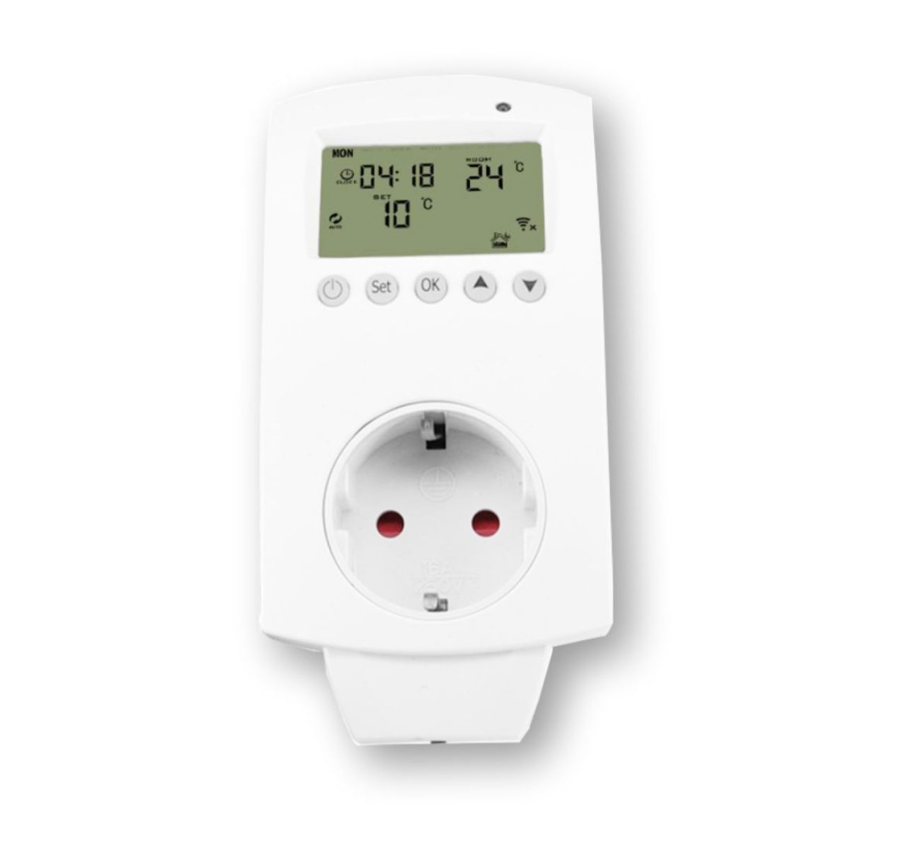 - Riadi napájanie pripojeného zariadenia cez výstupnú zásuvku podľa zvoleného programu, čím zabezpečuje úsporné a komfortné vykurovanie.